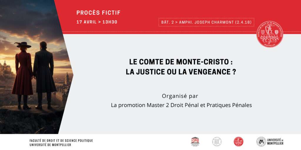 Le Comte de Monte-Cristo : La justice ou la vengeance ? Type d'évènement : Procès fictif Dates : 17 avril 2026 Horaires : 13h30 Lieu : Bât. 2 > Amphi. Joseph Charmont (2.4.18) Organisé par La promotion Master 2 Droit Pénal et Pratiques Pénales